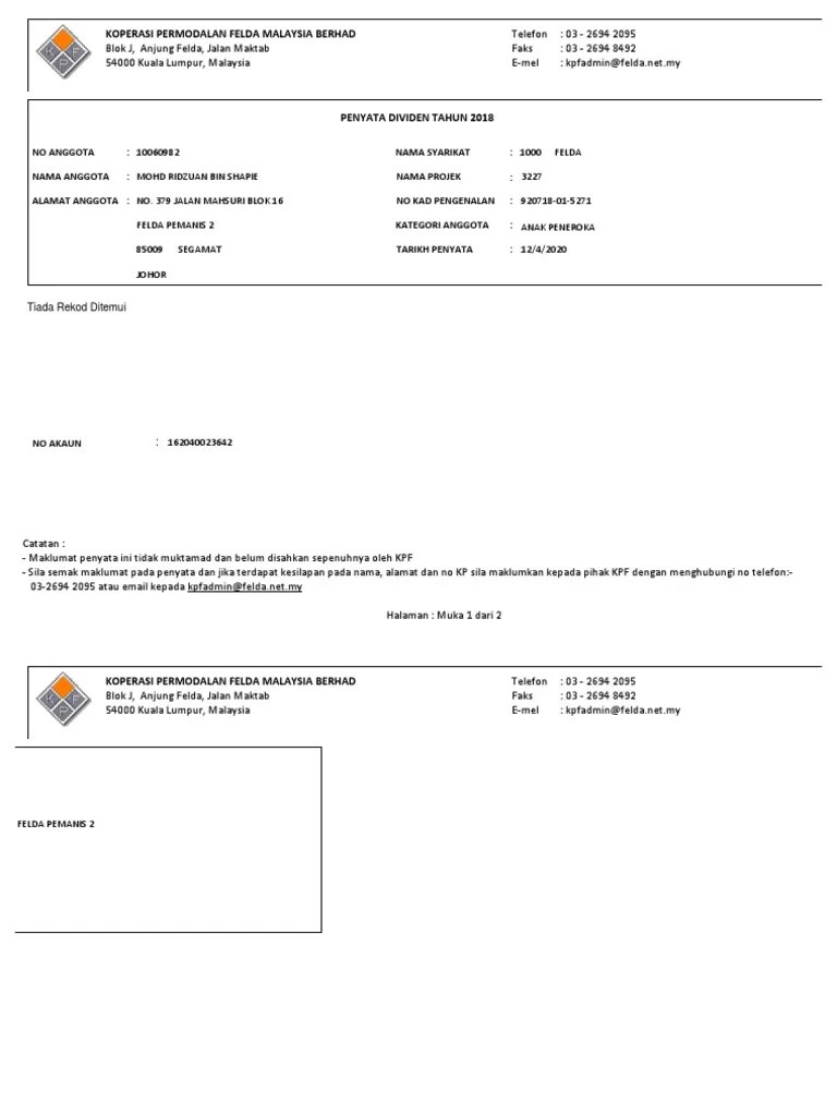 Pembayaran dividen kpf 2019 ( umum 2020). Sayangwang pembayaran dividen kpf2 2020 umum. Notis pembayaran baki dividen 2020. Koperasi permodalan felda malaysia 2 berhad (kpf2). Nak bertanya bagaimana nk beli saham kpf? Kemaskini pentadbir/penama anda secara atas talian. Sehingga artikel ini ditulis, pihak koperasi permodalan felda malaysia (kpf) masih belum membuat pengumuman pembayaran mengenai kadar dividen .